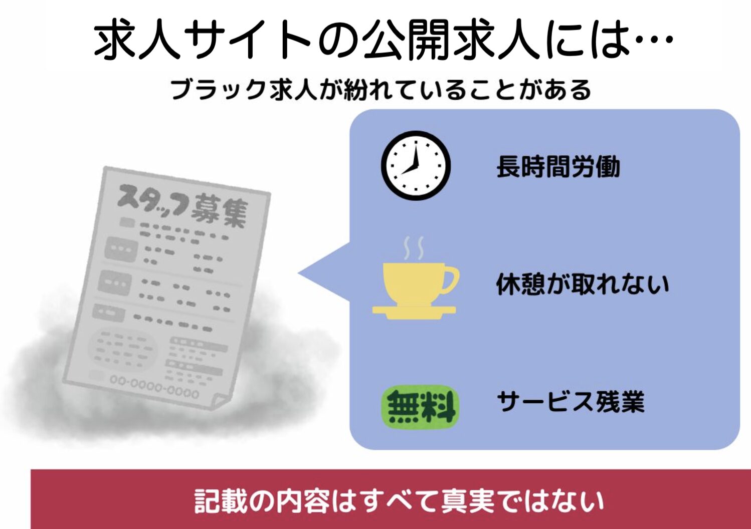 無料で掲載ができて、誰でも閲覧できる求人サイトの公開求人にはブラック求人が多数紛れ込んでいるので注意しなければなりません。