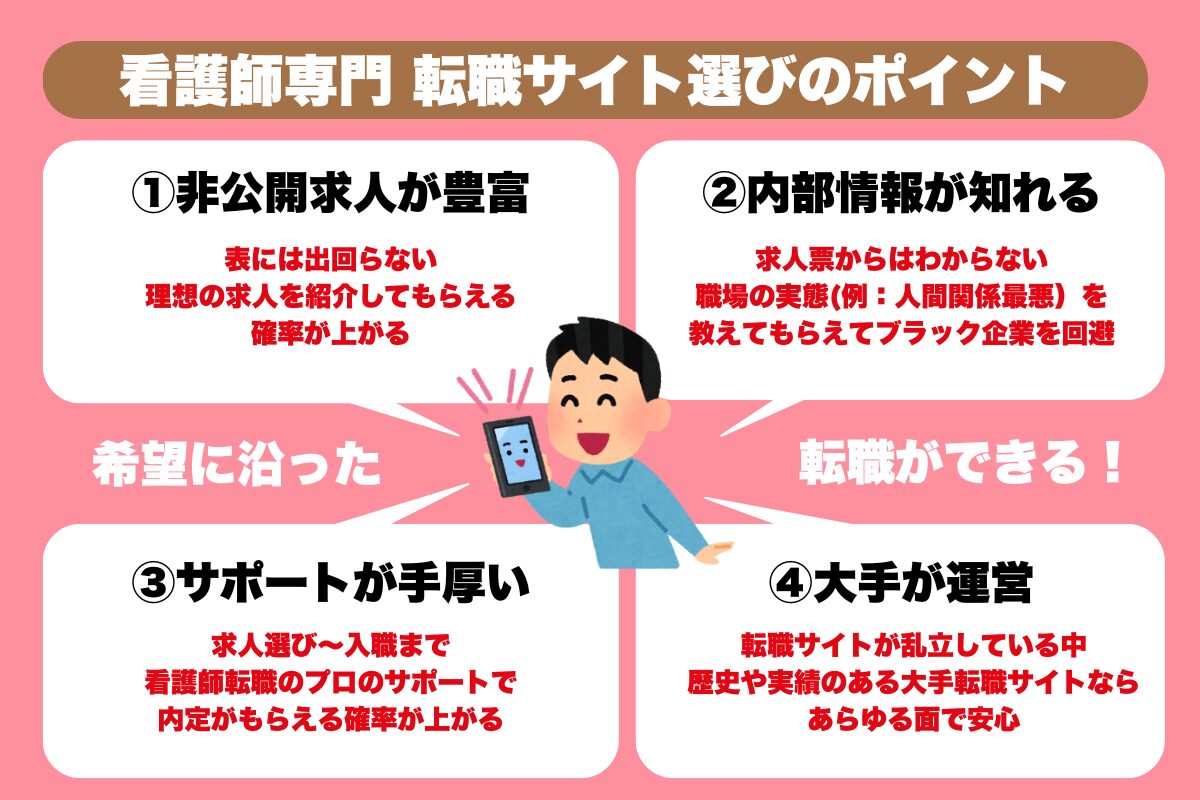 登録すべきは以下の4つのポイントを満たした看護師専門の転職サイトです。