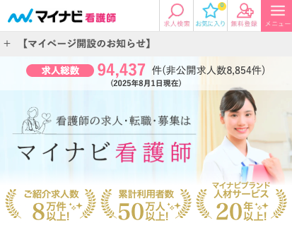 ナース専科は2005年に転職サイトの運営をスタートさせており、サービス運営20年以上の実績、累計登録者100万人以上の実績があります。