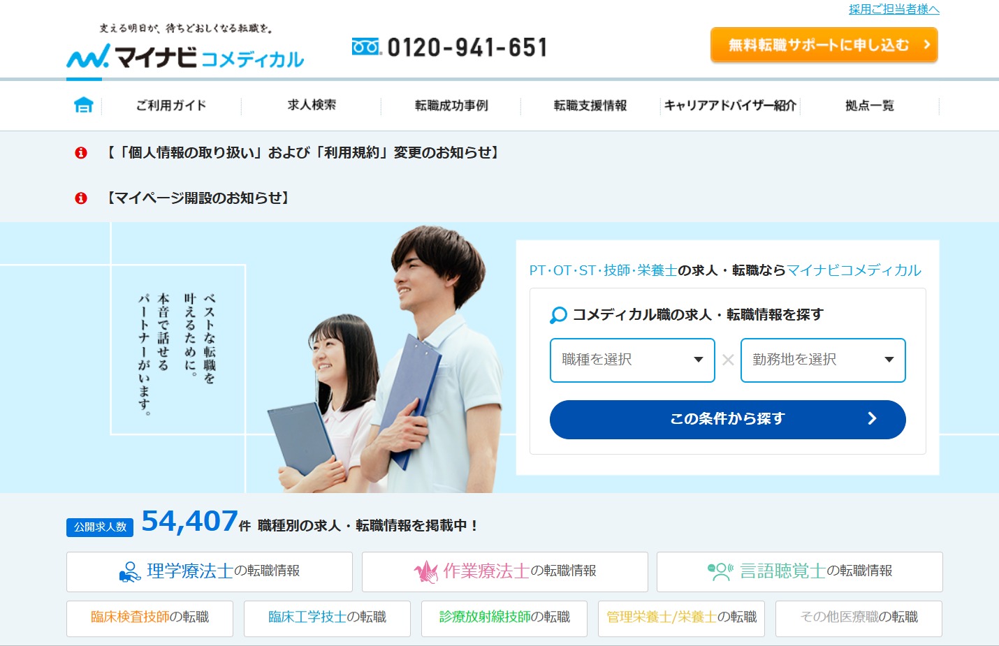 マイナビコメディカルは、理学療法士をはじめとするセラピスト、医療技術職、医療介護職に特化した完全無料の転職支援サービスです。