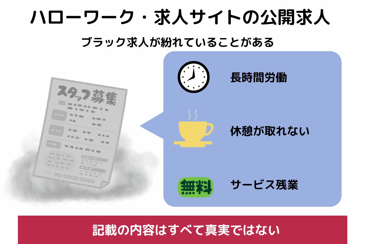 無料で掲載ができて、誰でも閲覧できるハローワーク・求人サイトの公開求人にはブラック求人が多数紛れ込んでいるので注意しなければなりません。
