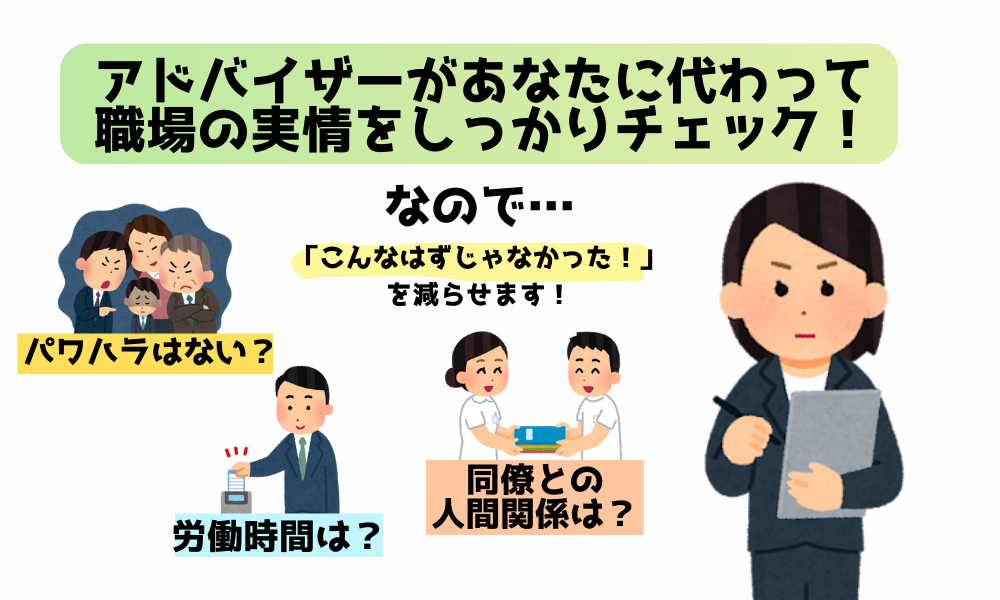 事前にアドバイザーと希望条件や仕事観・ライフスタイルについて、入念に打ち合わせができるため、こうした入職後のミスマッチが起こりづらくなります。