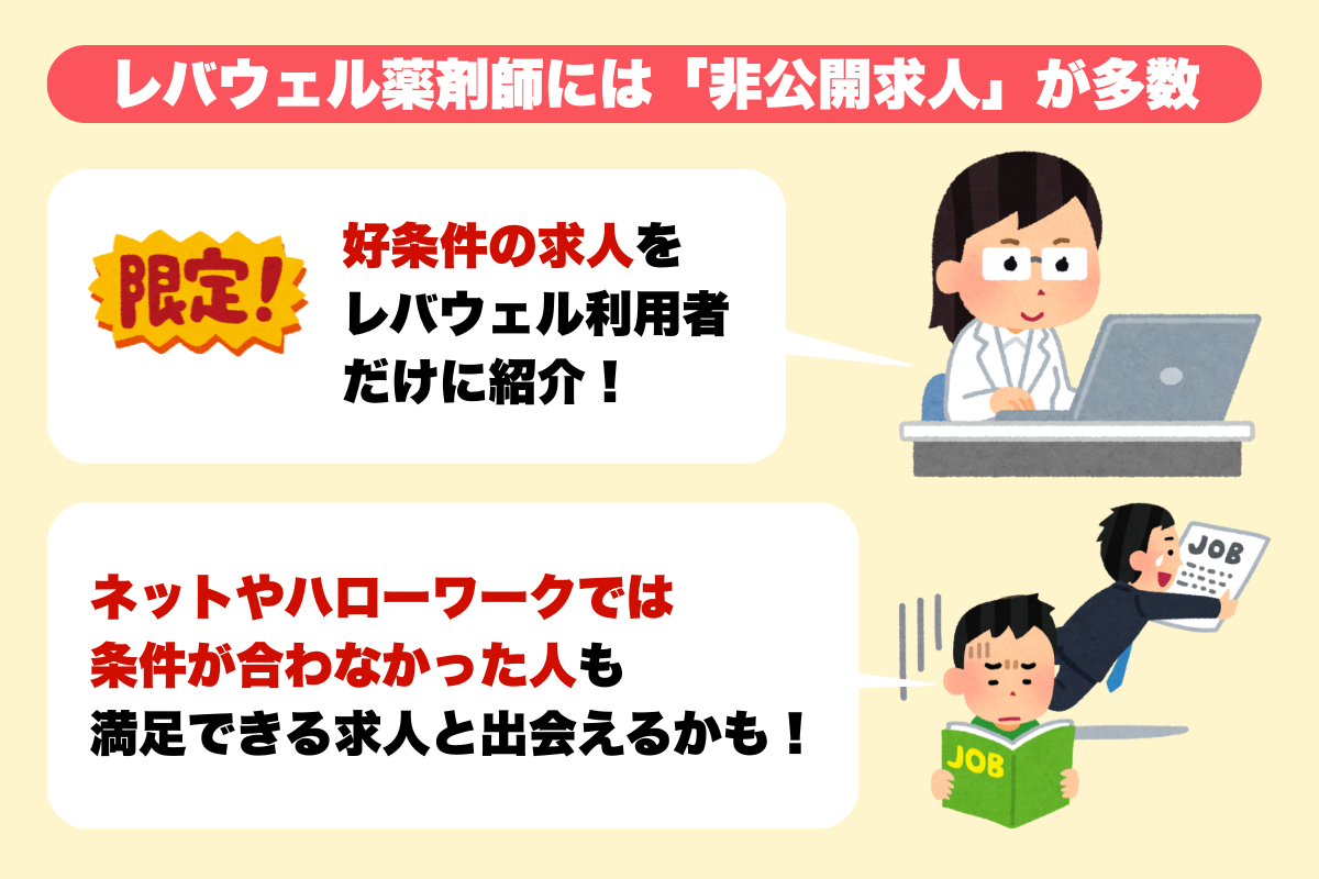 特にレバウェル薬剤師は、好条件・高待遇の求人を非公開求人として多数保有。