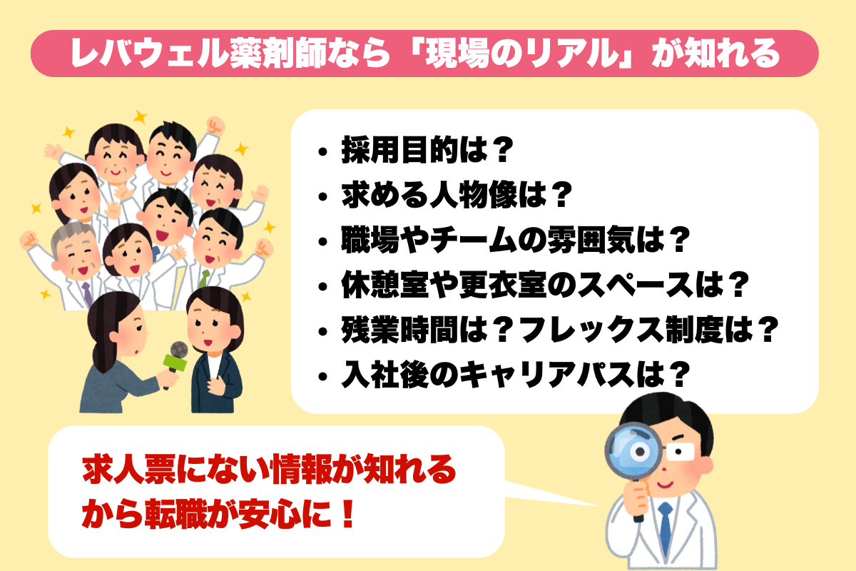 レバウェル薬剤師では、専門のアドバイザーが企業の採用担当者や働く人にインタビューを行い、求人票だけでは見えてこない職場の実情を聞き取っています。