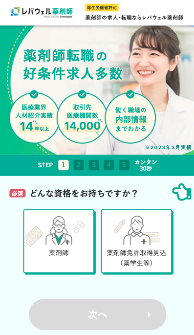 転職が初めてで不安な方から、納得いくまで転職活動を続けたい方まで、すべての方に寄り添ってくれるのがレバウェル薬剤師です!